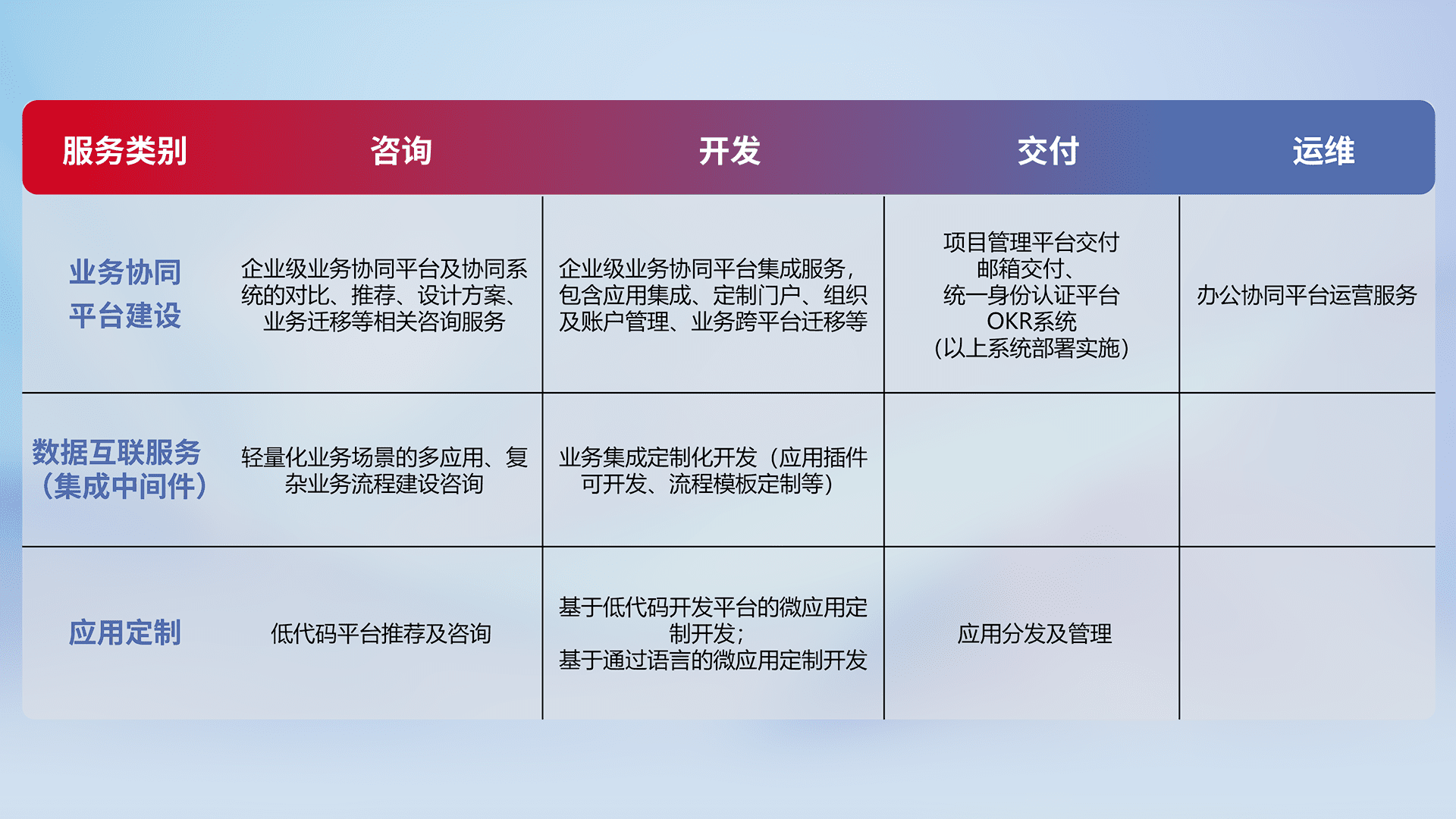 针对钉钉、、、、企微、、、、IDaas等平台级产品提供产品的规划、、、、方案、、交付、、、定制化开发等服务,,,,实现如统一协同办公、、、智能客户服务、、混合会议管理、、智能数据查询、、、、等业务场景,,,实现数字化转型。。