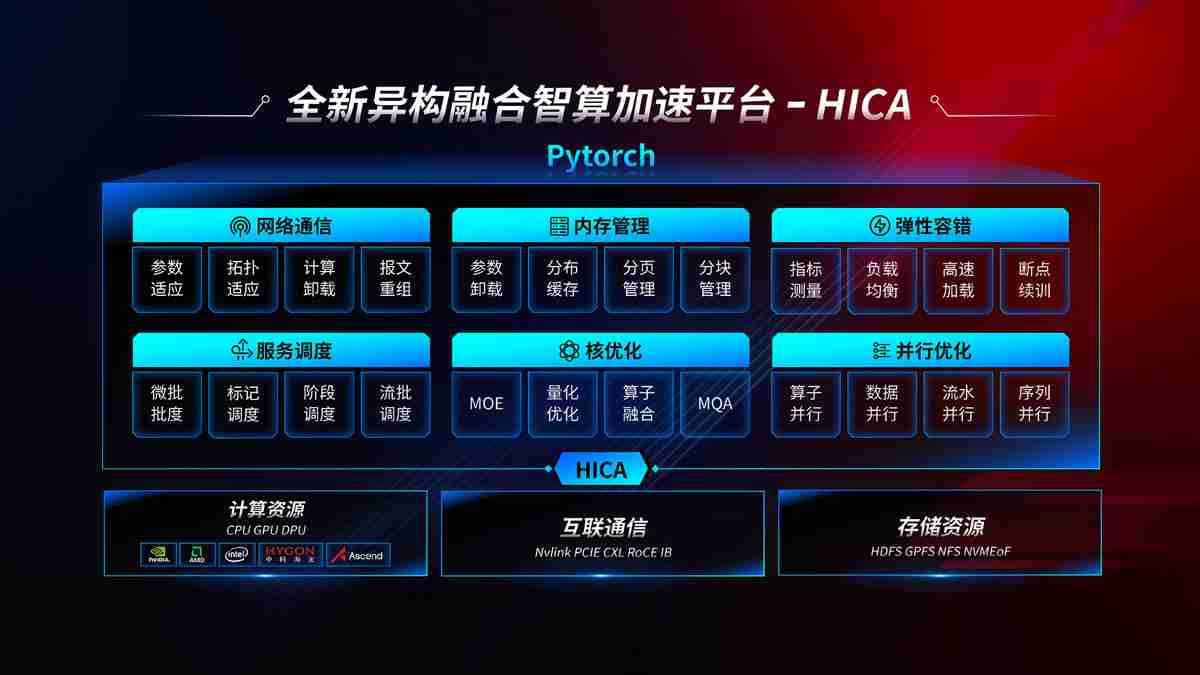 通过自研的服务层、、、中间适配层、、、以及调度编排算法,,采用数据并行、、、、模型并行等多种并行方式,,,把并行计算任务进行有效的分解,,,使其分别由相应的软件栈和算力资源来承接。。。当GPU资源变化,,HICA可以实时动态调度计算子任务并调整模型拓扑和架构,,,以充分聚合各种算力资源。。。