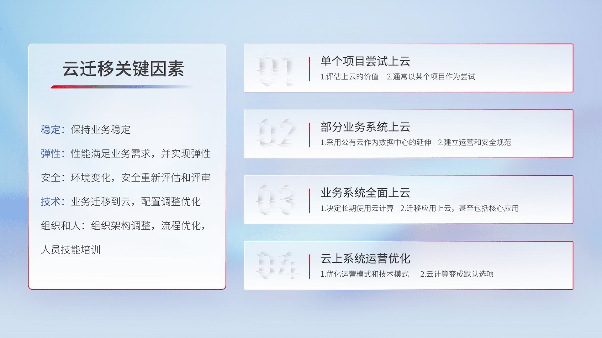 结合实际业务,,,,从规划设计、、、、云平台选型、、、、云原生改造、、数据迁移、、集成交付,,,,迁移全过程为客户识别最佳上云路径,,,做好风险识别管理,,,,设计网络架构、、、、身份权限、、安全审计合规、、操作审计、、、、日志审计、、、监控告警策略、、、多站点容灾设计等,,,对云上基础设施进行整体规划,,,,提升IT治理水平,,,以满足弹性、、、、高可用、、高性能的需求。。。。