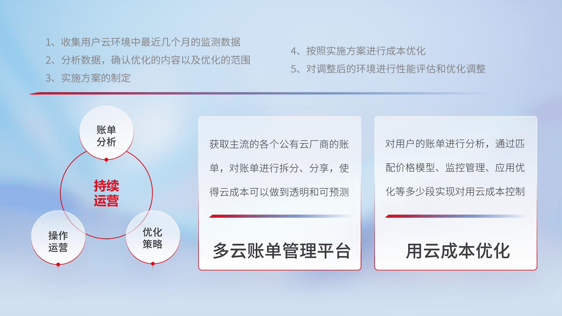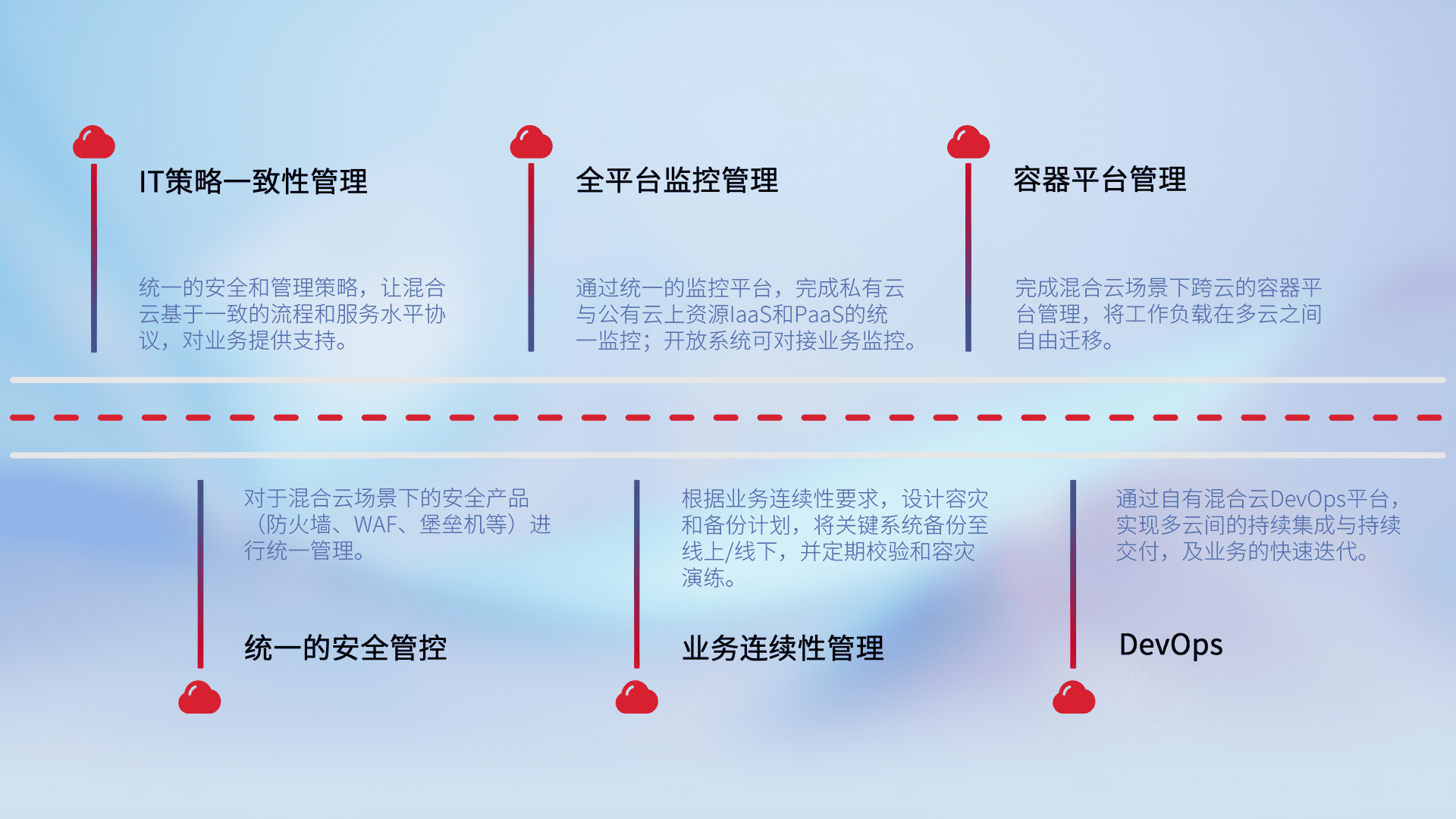 通过多云纳管,,,以统一的资源数据模型把客户的云资源进行抽象和封装,,进而实现对多云资源的统一操作,,保障云资源管理的可靠性、、、、稳定性与可用性。。。。量身定制化运维内容,,,,配置、、、开发运维、、补丁管理、、备份、、、、监控、、认证和访问管理、、、、审计和日常巡检等,,,保障在用云过程中的可靠度,,,,稳定度以及高可用率。。。。
